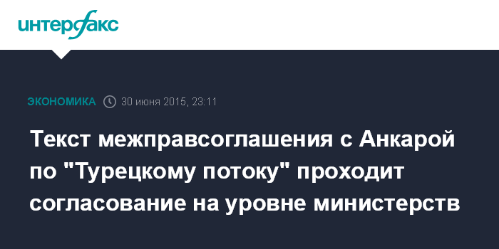 Москва. 30 июня. INTERFAX.RU - Профильные министерства России и Турции все еще сработают над текстом межправительственного соглашения по проекту морского газопровода "Турецкий поток".