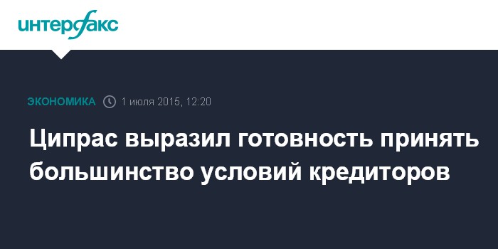 Москва. 1 июля. INTERFAX.RU – Премьер-министр Греции Алексис Ципрас готов принять почти все условия кредиторов, выставленные Афинам в минувшие выходные, с минимальными исключениями, пишет Financial Times.