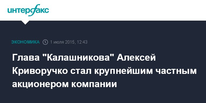 Москва. 1 июля. INTERFAX.RU – Генеральный директор ОАО "Концерн "Калашников" Алексей Криворучко стал крупнейшим частным акционером компании, следует из материалов базы "СПАРК-Интерфакс".