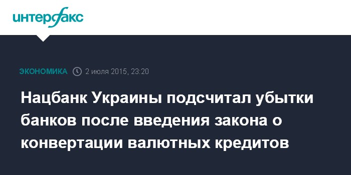 Москва. 2 июля. INTERFAX.RU - Национальный банк Украины (НБУ) заявил о разрушительном ущербе для финансовой и банковской системы страны из-за принятия закона о принудительной конвертации валютных кредитов по курсу на момент их выдачи. По мнению банка, закон также поставит под угрозу благосостояние всех граждан Украины.