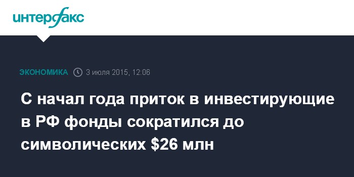 Москва. 3 июля. INTERFAX.RU – Совокупный чистый приток денежных средств в фонды, инвестирующие в акции России, с начала года по 1 июля 2015 года сократился до символических $26 млн, свидетельствуют данные Emerging Portfolio Fund Research.