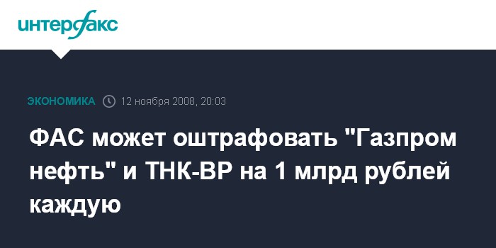 Москва. 12 ноября. INTERFAX.RU - Федеральная антимонопольная служба (ФАС) РФ в среду рассмотрела вопрос о привлечении ОАО "Газпром нефть" и ОАО "ТНК-ВР Холдинг" к административной ответственности в виде штрафа за злоупотребление доминирующим положением.