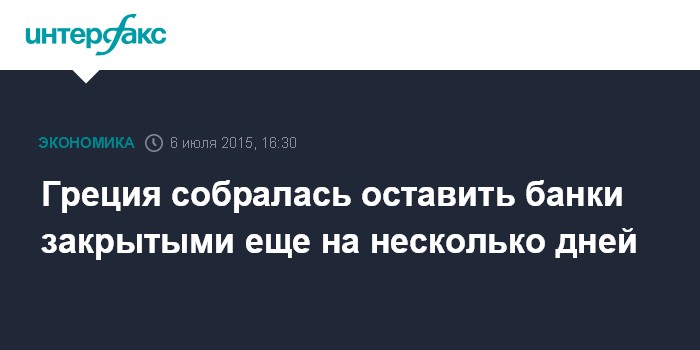 Москва. 6 июля. INTERFAX.RU – Правительство Греции может оставить банки закрытыми еще на несколько дней; соответствующий указ, как ожидается, будет обнародован 6 июля, сообщает Thomson Reuters со ссылкой на источники в банковских кругах.
