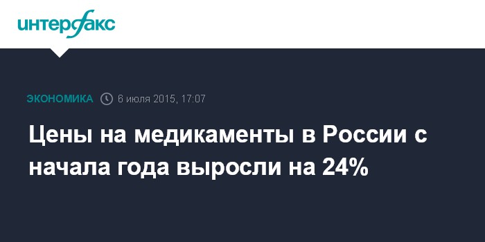 Москва. 6 июля. INTERFAX.RU – Цены на медикаменты в России в январе-июне 2015 года выросли на 24,3% по сравнению с аналогичным периодом годом ранее, свидетельствуют данные Росстата.