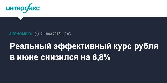 Москва. 7 июля. INTERFAX.RU – Реальный эффективный курс рубля к корзине валют государств - основных торговых партнеров России в июне 2015 года снизился на 6,8%, по предварительной оценке ЦБ РФ, опубликованной на его сайте.