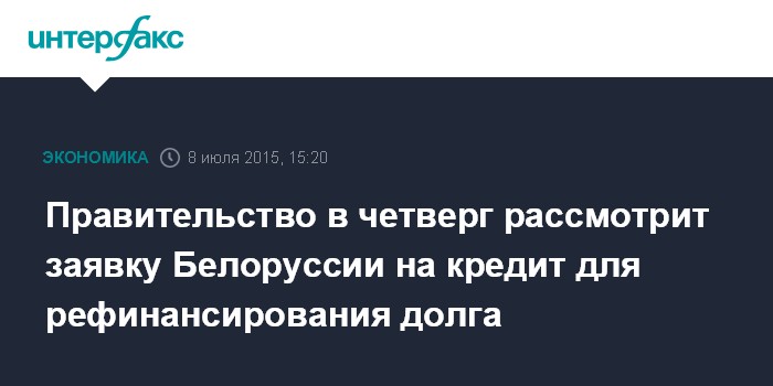 Москва. 8 июля. INTERFAX.RU – Правительство России в четверг рассмотрит заявку Белоруссии на кредит для рефинансирования долга, сообщил журналистам замминистра финансов РФ Сергей Сторчак.