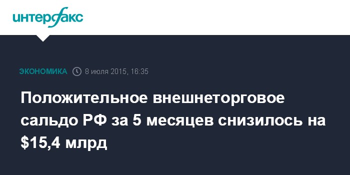 Москва. 8 июля. INTERFAX.RU – Положительное внешнеторговое сальдо РФ в январе-мае 2015 года составило $80,8 млрд, что на $15,4 млрд меньше показателя за аналогичный период 2014 года.