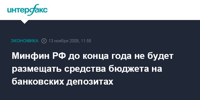 Москва. 13 ноября. INTERFAX.RU - Минфин РФ до конца года не будет размещать средства бюджета на банковских депозитах, сообщил агентству "Интерфакс-АФИ" замдиректора департамента международных финансовых отношений, госдолга и госфинактивов Минфина Петр Казакевич.