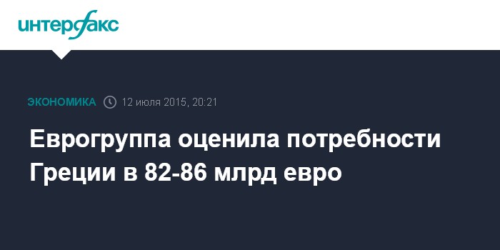 Москва. 12 июля. INTERFAX.RU - Еврогруппа оценила потребности Греции в сумму 82-86 млрд евро, сообщает в воскресенье французская газета Le Figaro со ссылкой на проект документа.