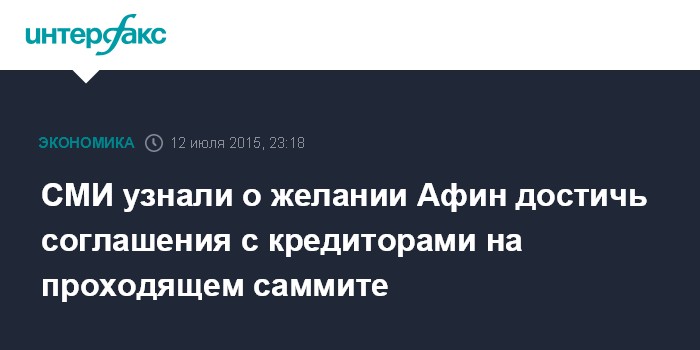 Москва. 12 июля. INTERFAX.RU - Греческие власти хотят заключить соглашение с кредиторами на проходящем в настоящее время саммите стран лидеров еврозоны, сообщает в воскресенье агентство АП со ссылкой на представителя властей Греции.