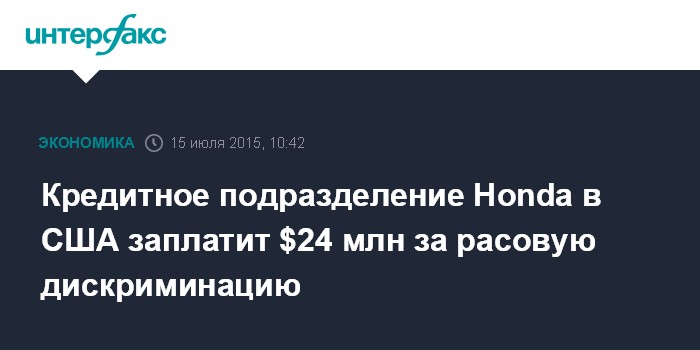 Москва. 15 июля. INTERFAX.RU – Кредитное подразделение японского автомобильного концерна Honda в США согласилось выплатить $24 млн своим клиентам, принадлежащим к латиноамериканскому, черному или иным этническим меньшинствам в США, после того как компанию обвинили в расизме, передает "Би-Би-Си".