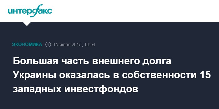 Москва. 15 июля. INTERFAX.RU – Большей частью внешнего суверенного и квазисуверенного долга Украины владеют 15 крупных западных инвестиционных фондов, сообщил правительственный уполномоченный по вопросам управления государственным долгом Виталий Лисовенко в интервью украинской газете "Сегодня". Крупнейшим из них является фонд Franklin Templeton.