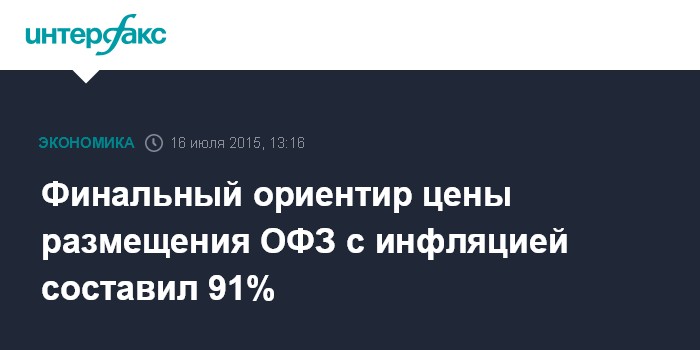 Москва. 16 июля. INTERFAX.RU – Финальный ориентир цены размещения ОФЗ с привязкой к инфляции составил 91% от номинала, сообщил "Интерфаксу" источник в банковских кругах. Первоначально ориентир составлял 87-92% от номинала, позже он был сужен до 90-91% от номинала.