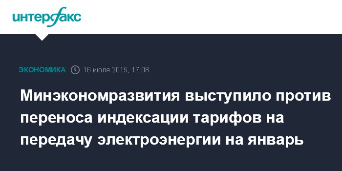 Москва. 16 июля. INTERFAX.RU – Минэкономразвития выступило против переноса индексации тарифов на передачу электроэнергии с июля на январь начиная с 2016 года, рассказал "Интерфаксу" источник, знакомый с текстом письма замглавы ведомства Николая Подгузова в адрес Федеральной службы по тарифам.