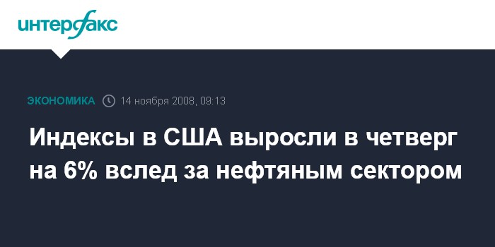 Москва. 14 ноября. INTERFAX.RU - Американские фондовые индексы выросли в четверг более чем на 6% вслед за акциями энергетических компаний и представителей сферы недвижимости, сообщает агентство Bloomberg. В пятницу фьючерсы на индексы снижаются на 0,7-1%.