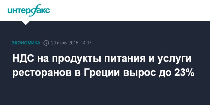 Москва. 20 июля. INTERFAX.RU – Налог на добавленную стоимость целого ряда товаров и услуг в Греции существенно повышен с 20 июля в рамках соглашения Афин с кредиторами о предоставлении стране дальнейшей финансовой помощи.