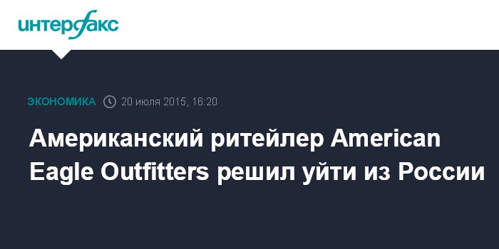 Москва. 20 июля. INTERFAX.RU – Крупный американский ритейлер American Eagle Outfitters закрывает магазины в России, сообщает газета "Ведомости". В настоящее время в Москве работают три магазина American Eagle: один в "Афимолл сити" и два "Меге". Магазин в "Афимолле" закроется до конца текущей недели, в "Меге" – до 6 августа. Ранее были закрыты магазины в ТЦ "Европейский" и "Авиапарк", пишет газета.