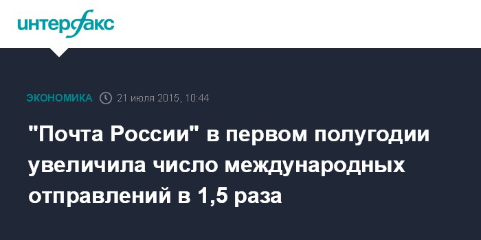 Москва. 21 июля. INTERFAX.RU – Количество международных посылок и мелких пакетов, обработанных "Почтой России" в первом полугодии 2015 года, увеличилось в 1,5 раза по сравнению с аналогичным показателем годом ранее, до 49 млн, говорится в сообщении компании. Показатель включает импортные, экспортные и транзитные отправления.
