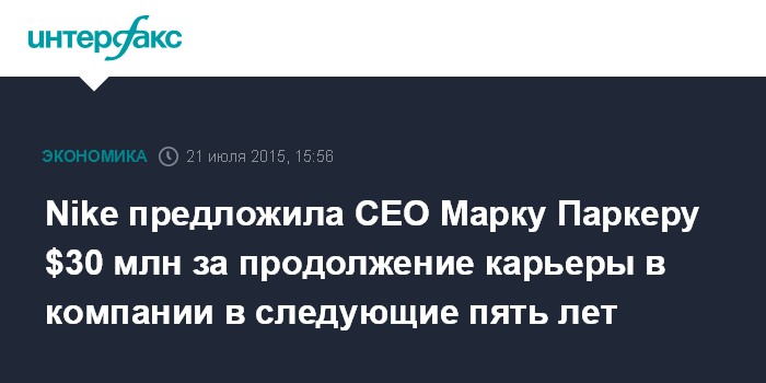 Москва. 21 июля. INTERFAX.RU – Американский производитель спортивных товаров Nike Inc. предложил своему главному исполнительному директору Марку Паркеру бонус в виде акций на $30 млн с тем, чтобы он оставался на этой должности на протяжении последующих пяти лет, сообщает агентство Bloomberg.