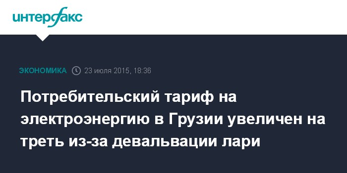 Москва. 23 июля. INTERFAX.RU - Национальная комиссия по регулированию энергетики и водоснабжения Грузии (GNERC) на заседании в четверг приняла решение повысить с 1 августа на 0,03348 лари (0,85 рубля), или в среднем на 32,3%, потребительский тариф на электроэнергию для абонентов компании Energo-Pro Georgia, осуществляющей поставки почти во все регионы страны.