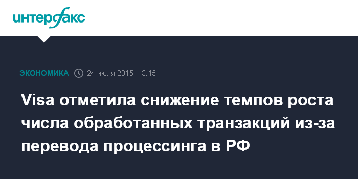 Москва. 24 июля. INTERFAX.RU – Международная платежная система Visa отмечает снижение темпов роста числа обработанных транзакций из-за перевода обработки внутрироссийских транзакций в Национальную систему платежных карт (НСПК).