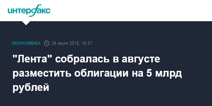 Москва. 24 июля. INTERFAX.RU – Ритейлер "Лента" планирует в августе разместить биржевые облигации на 5 млрд рублей, сообщили "Интерфаксу" источники в банковских кругах.