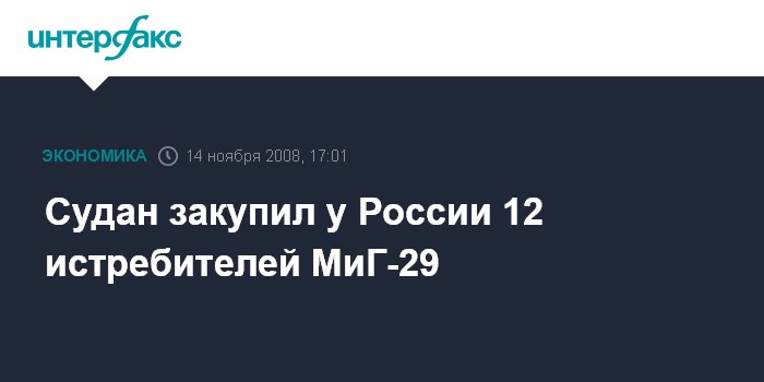Москва. 14 ноября. INTERFAX.RU - Россия поставила Судану 12 боевых самолетов МиГ-29 в рамках ранее заключенного контракта, сообщил министр обороны Судана Абдель Рахим Мухаммед Хусейн.