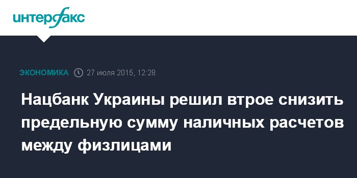 Москва. 27 июля. INTERFAX.RU – Национальный банк Украины намерен сузить сферу использования наличности, снизив предельную сумму наличных расчетов между физическими лицами в три раза - до 50 тыс. грн, сообщается на сайте регулятора. Проект постановления вынесен на обсуждение, предложения по нему будут приниматься до 25 августа текущего года.