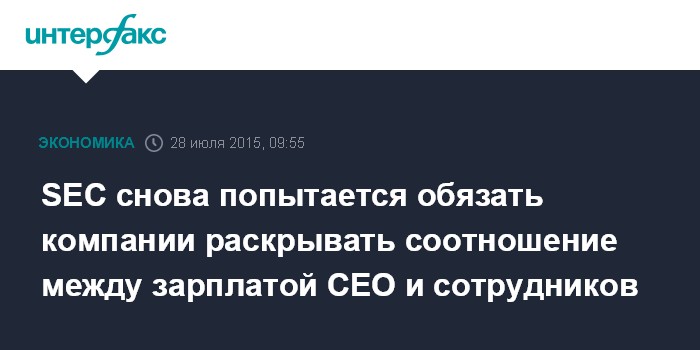 Москва. 28 июля. INTERFAX.RU – Американская Комиссия по ценным бумагам и биржам (SEC) намерена к осени в окончательном виде подготовить требования к публичным компаниям, касающиеся раскрытия среднего соотношения между зарплатой CEO и сотрудников, сообщает The Wall Street Journal.