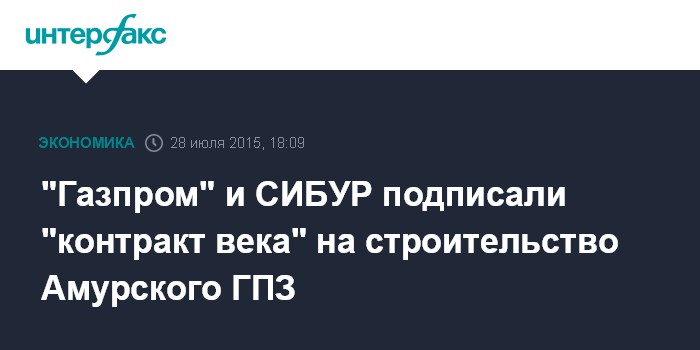 Москва. 28 июля. INTERFAX.RU - "Газпром" и СИБУР подписали "контракт века" на строительство Амурского ГПЗ, стоимость которого, как ранее сообщалось, оценивается в 791 млрд рублей (включает НДС и вознаграждение подрядчика).