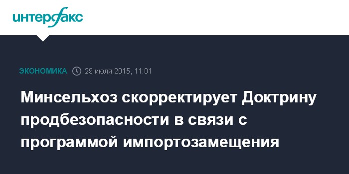 Москва. 29 июля. INTERFAX.RU – Минсельхоз внесет изменения в Доктрину продовольственной безопасности в связи с программой импортозамещения.