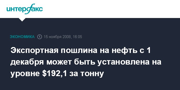 Москва. 15 ноября. INTERFAX.RU - Пошлина на экспорт нефти из РФ с 1 декабря может быть установлена на уровне $192,1 за тонну, сообщил агентству "Интерфакс-АФИ" заместитель начальника отдела таможенных платежей Минфина РФ Александр Сакович.