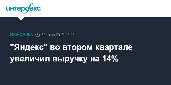 Москва. 30 июля. INTERFAX.RU – Выручка "Яндекса" по US GAAP во втором квартале 2015 года составила 13,9 млрд рублей, что на 14% превышает показатель аналогичного периода 2014 года, говорится в сообщении компании.