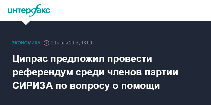 Москва. 30 июля. INTERFAX.RU – Премьер-министр Греции Алексис Ципрас, пытаясь заручиться поддержкой однопартийцев, предложил провести в воскресенье референдум среди членов СИРИЗА по вопросу о новом пакете международной помощи, сообщает Financial Times.