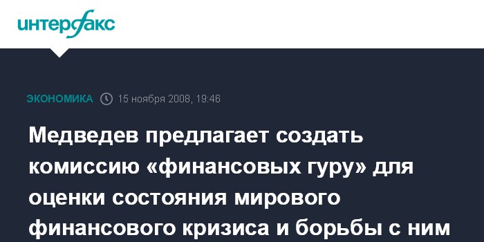 Медведев предлагает создать комиссию «финансовых гуру» для оценки состояния мирового финансового кризиса и борьбы с ним
