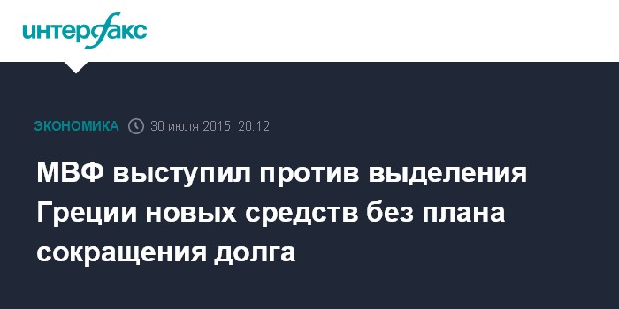 Москва. 30 июля. INTERFAX.RU - Международный валютный фонд (МВФ) будет выступать против предоставления Греции новой финансовой помощи, пока страны-члены еврозоны не согласуют четкий и конкретный план сокращения долговой нагрузки на страну, сообщает агентство Bloomberg со ссылкой на источник в фонде.