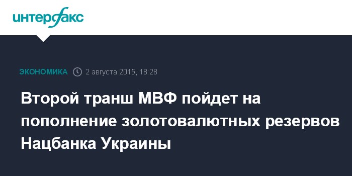 Москва. 2 августа. INTERFAX.RU - Премьер-министр Украины Арсений Яценюк заявил, что второй транш кредита Международного валютного фонда Украине объемом $1,7 млрд, поступление которого ожидается в ближайшие дни, будет направлен на пополнение золотовалютных резервов Национального банка Украины.