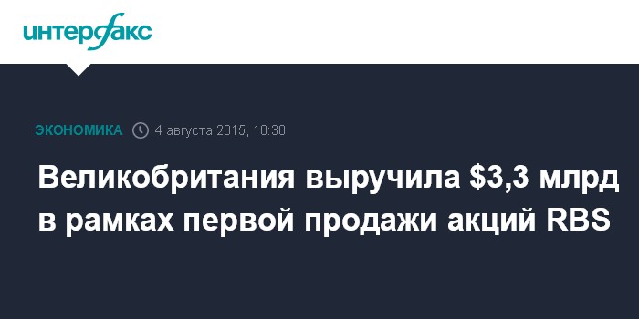 Москва. 4 августа. INTERFAX.RU – Министерство финансов Великобритании во вторник завершило продажу первого блока акций Royal Bank of Scotland Group (RBS), выручив по ее итогам 2,1 млрд фунтов стерлингов ($3,3 млрд) - чуть больше ожидавшихся 2 млрд фунтов.