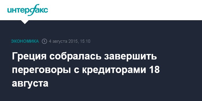 Москва. 4 августа. INTERFAX.RU – Греция рассчитывает завершить переговоры с международными кредиторами о новой программе помощи к 18 августа, причем составление проекта соглашения начнется уже в среду, передает MarketWatch со ссылкой на сообщения различных СМИ.