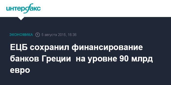 Москва. 5 августа. INTERFAX.RU – Европейский центральный банк сохранил предельный объем финансирования греческих банков в рамках программы экстренного предоставления ликвидности (Emergency Liquidity Assistance, ELA) на уровне 90,4 млрд евро, сообщает агентство Bloomberg со ссылкой на осведомленные источники.