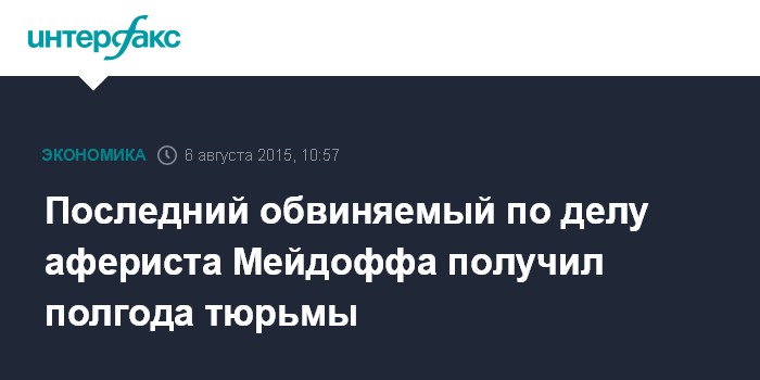 Москва. 6 августа. INTERFAX.RU – Последний обвиняемый по громкому делу финансиста Бернарда Мейдоффа, отбывающего срок за создание финансовой пирамиды, приговорен к шести месяцам тюрьмы.