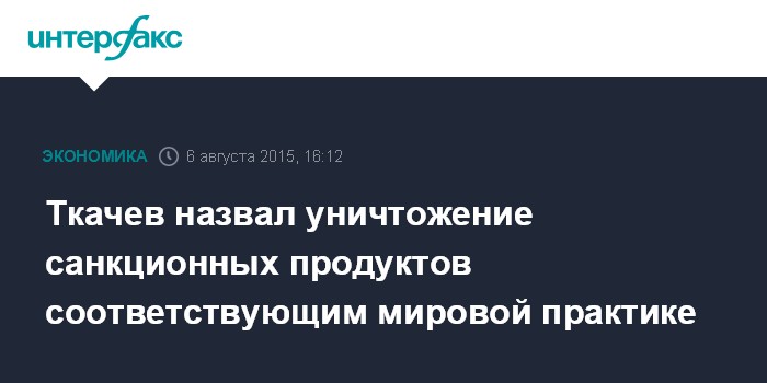 Москва. 6 августа. INTERFAX.RU –Уничтожение санкционного продовольствия соответствует мировой практике, заявил министр сельского хозяйства РФ Александр Ткачев