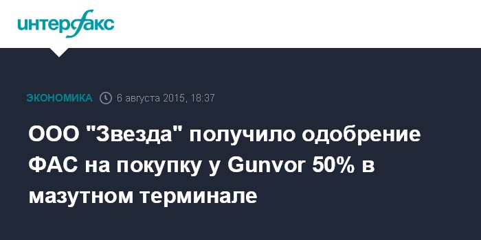 Москва. 6 августа. INTERFAX.RU - Федеральная антимонопольная служба одобрила ходатайство ООО "Звезда" на покупку 50% ООО "Новороссийский мазутный терминал" у трейдера Gunvor, сообщили "Интерфаксу" в ведомстве.