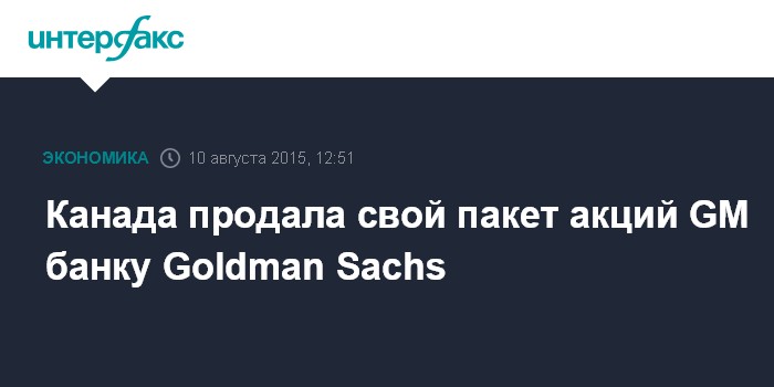 Москва. 10 августа. INTERFAX.RU – Канадская государственная инвесткомпания Canada GEN Investment продала все имевшиеся у нее акции американского автомобилестроительного концерна General Motors Corp. банку Goldman Sachs, сообщает агентство Bloomberg.