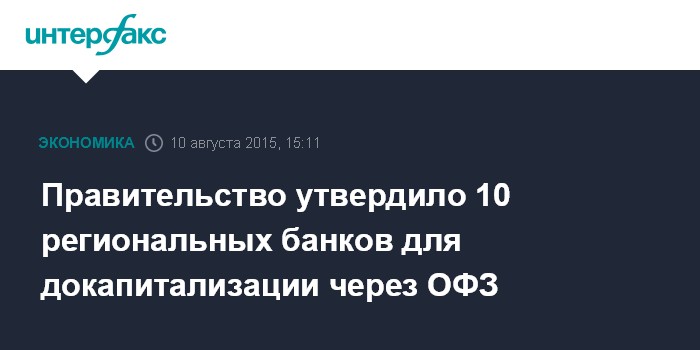 Москва. 10 августа. INTERFAX.RU – Правительство утвердило список из 10 региональных банков, которые смогут принять участие в программе докапитализации через ОФЗ, говорится в официальном твиттере правительства.