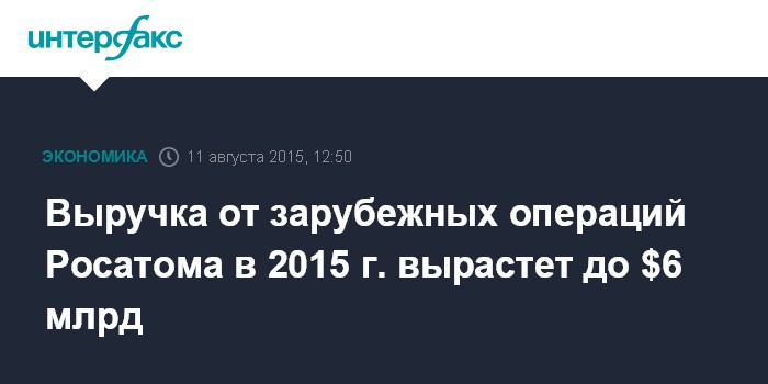 Москва. 11 августа. INTERFAX.RU – Госкорпорация "Росатом" планирует, что благодаря курсовым разницам выручка от зарубежной деятельности увеличится в 2015 годудо $6 млрд с $5,2 млрд в 2014 году, говорится в материалах "Росатома".