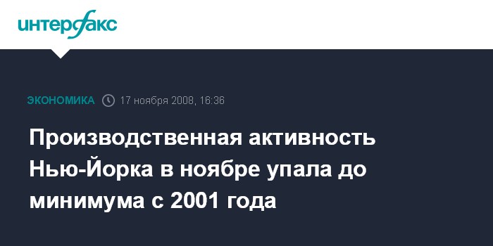 Москва. 17 ноября. INTERFAX.RU - Индекс производственной активности Нью-Йорка Empire Manufacturing в ноябре упал до минимума с 2001 г., сообщило агентство Bloomberg.