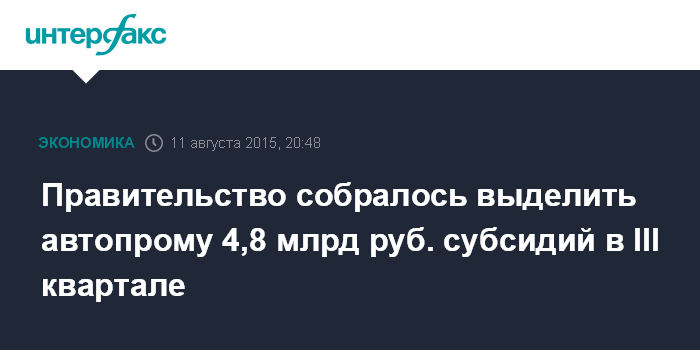 Москва. 11 августа. INTERFAX.RU - Правительство РФ намерено выделить автопроизводителям в III квартале 2015 года 4,824 млрд рублей субсидий на компенсацию части затрат.