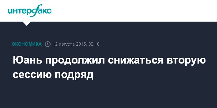 Москва. 12 августа. INTERFAX.RU - Курс юаня снижается второй день подряд, отражая слабые перспективы экономического роста Китая. После рекордной девальвации во вторник он опустился на рыночных торгах на максимальные за два десятилетия 1,8%, а в среду упал еще на 1,6% - до 6,4264/$1, сообщает агентство Bloomberg.
