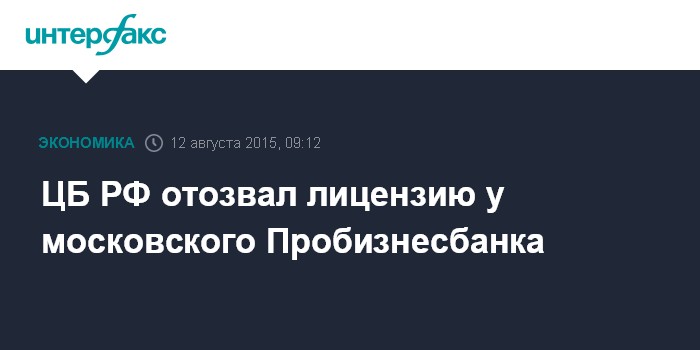 Москва. 12 августа. INTERFAX.RU - Центральный банк России отозвал лицензию на осуществление банковских операций у Пробизнесбанка (Москва), говорится в сообщении ЦБ РФ.